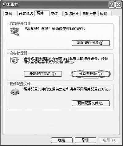 初学者在谈到“设备管理器”的时候,可能会有这样的疑问:在“附件/系统工具”中为何找不到这“设备管理器”呢?它在哪里呢?其实它“隐藏”在“系统属性”中,我们可以这样找到它:右击桌面“我的电脑”图标,在出现的快捷菜单中选择“属性”打开“系统属性”窗口,选择“硬件”选项卡,在如图1所示的窗口中,单击“设备管理器”按钮就可以打开设备管理器了。