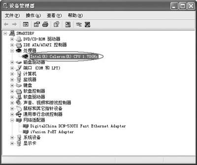 打开设备管理器,我们会看到计算机中安装的各种硬件设备已经按类型进行了排列,默认的是依类型排序,我们还可以通过“查看”菜单选择其他的排序方式。在这里,用鼠标右键双击任何一个设备类型名称或点击名称前的“+”号就可以看到具体的设备。比如双击“处理器”就会展开并显示安装的CPU具体的名称和型号,如图2所示。用同样的方法,我们双击“显示卡”能看到安装的显卡名称、型号。