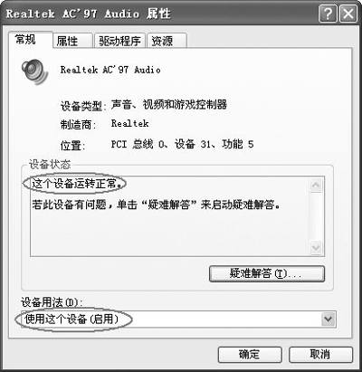 双击声卡设备或通过右键菜单的“属性”命令可以打开该声卡设备的属性窗口。一般常见的有三个标签选项卡:常规、驱动程序和资源。在“常规”中我们可以看到硬件设备的相关信息、运行状态(是否正常工作)、设备用法(启用或停用),如图4所示;在“驱动程序”中我们可以看到已安装声卡驱动程序的相关信息,包括提供商、日期、版本等,在这里还能更新、卸载和还原驱动程序;在“资源”中可以了解到系统为硬件分配的中断请求、输入/输出端口地址等资源,看有无冲突。