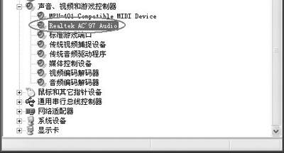 这里我们以对声卡的操作为例(笔者使用的是主板内置的Realtek AC'97 Audio),介绍它在设备管理器中常用的操作。首先,打开任务管理器,双击声卡对应的设备类型(即“声音、视频和游戏控制器”)找到声卡设备。