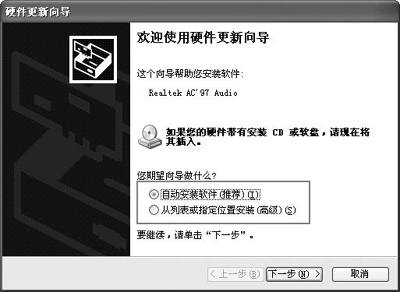 “自动安装”可以让系统搜索你的光驱、软驱和Windows驱动程序存放的目录并自动安装新版的驱动程序。所以如果该硬件有安装CD或软盘,我们可以先将它们放入相应位置,再选中“自动安装软件(推荐)”,单击“下一步”来自动完成安装。