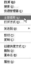 如果已经安装了压缩软件,你在右键快捷菜单中是看不到这个“全部提取”命令的,我们可以选择快捷菜单中“打开方式”→“Compressed (zipped) Folders”命令,来打开该压缩文件,将其中的内容全部拷贝到某个文件夹中,就相当于完成了解压。