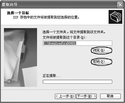 如果没有安装任何压缩软件,在弹出的快捷菜单中(如图1所示),我们会看到一个“全部提取”命令,选择该命令就会运行Windows XP的压缩文件夹“提取向导”,单击“下一步”,进入图2所示的窗口,在其中需要我们选择文件提取(解压)后存放的目录,可以通过旁边的“浏览”按钮来选择。如果该压缩文件进行了密码保护,我们可以单击“密码”按钮输入相应的密码。再单击“下一步”,这样就完成了解压。