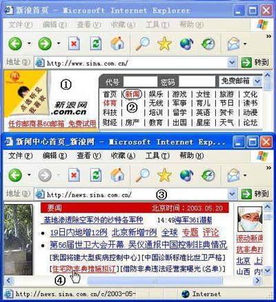 浏览网页主要是通过超级链接(鼠标移至链接内容上时会出现图标)来访问我们感兴趣的内容。例如我们想看看新浪上的新闻,其具体操作步骤如下: