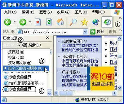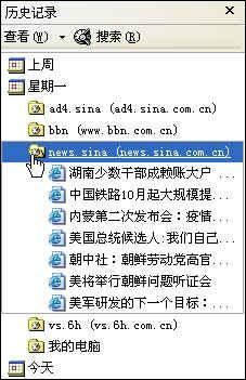 豆仔提示:这个列表中最多可存放9个网页记录,而且是刚才访问过的。要想找到更多的网页,就要用“历史记录”栏了。