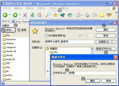 ⑤单击“确定”按钮,关闭文本框。以后在收藏夹中单击“新闻”文件夹,就可以找到这个网页了。