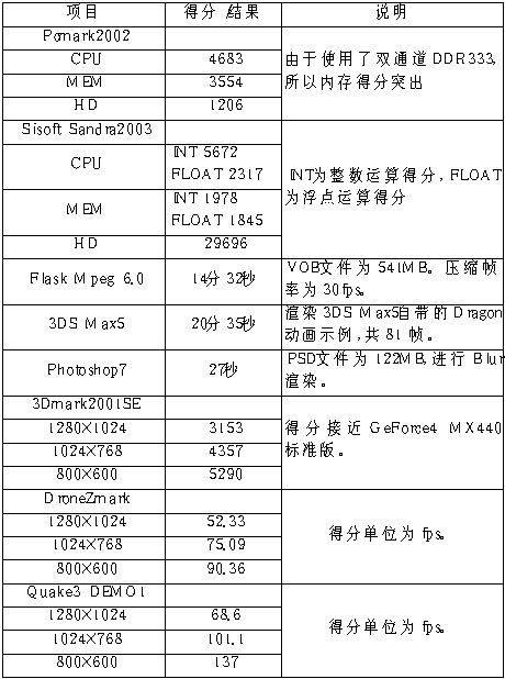 测试软件:SiSoft Sandra2003;PCMark2002;FlaskMpeg 6;3DS Max5;PhotoShop 7.0;3Dmark2001SE Build 330;Quake3;DronZ Mark;GunMetal。