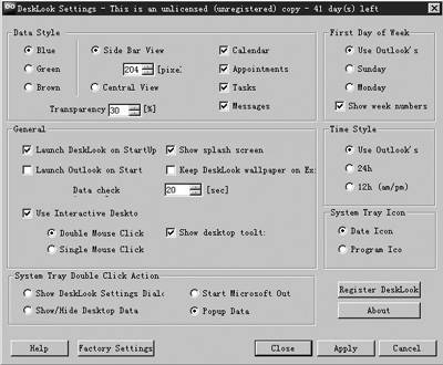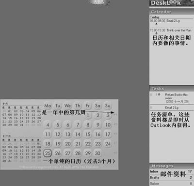 Desklook(http://www.xemico.com/desklook/desklook.zip)是一个Outlook的辅助工具,必须和Outlook同时使用。它能把Outlook内的日历(Calendar)、约会(Appointment)、任务(Tasks)和邮件(Messages)等资料都显示在桌面上,让你一开机就能马上看到。