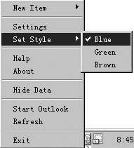右键点击软件在系统栏里的图标,可以对软件进行设置(图2)。“Set Style”(选择风格)是选择软件显示资料时所用的色彩主题,有蓝色(Blue)、绿色(Green)和棕色(brown)3种主题。“Hide Data”指的是不在桌面上显示上述资料,若想临时获得最大的桌面可视空间,就可以选择这个选项。点击“Start Outlook”,可以直接启动Outlook程序。“Refresh”(刷新)用于检查Outlook内的数据是否已经改变。