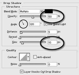 在Layers面板上,单击底部的添加图层样式按钮,在菜单中选择Drop Shadow,于是弹出图层样式对话框,左侧的Drop Shadow已经被选取,我们在右侧将阴影的Opacity降为50%,将Size设为10像素,其余选项保持默认(图3)。