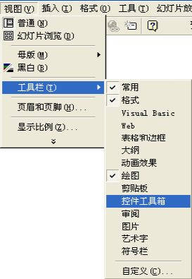 首先选定要插入Flash动画的幻灯片,在PowerPoint菜单栏的“视图”、“工具栏”中选中“控件工具箱”打开控件工具箱(图1),在“控件工具箱”上点选“其他控件”,会出现一个下拉菜单,在下拉菜单中点选“Shockwave Flash Object”(图2),这就是播放Flash的控件,点选后鼠标变为十字形,这样你就可以在幻灯片上拖拉出一个展示框,大小可任意调节。然后在这个框上点击鼠标右键,点选“属性”会出现ShockwaveFlash1控件属性编辑栏,点选“Movie”栏(图3),在此栏中写入你的Flash动画的路径和文件名(如果Flash动画与你的幻灯片在同一目录下可直接写文件名就可以了)。这样插有Flash动画的幻灯片就做好了。
