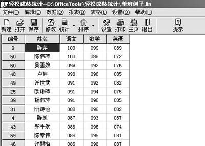 现在很多学校期末考试刚刚结束,对于大部分教师来说,这时候最累人的一件事就是成绩统计了。特别是班主任,不但要对自己所担任的课程成绩进行统计,而且还要计算全部学科的总分、平均分及各个分数段的情况,为了保证结果的准确性,一般来说至少要统计两遍。《轻松成绩统计》可以帮你从繁重的成绩统计工作中解放出来,该软件下载地址:http://www.skycn.com/soft/6788.html。软件的主界面如图1所示,下面简要谈一下该软件的使用。