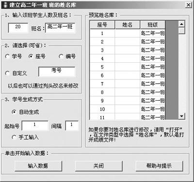 执行主菜单“文件→新建库”,弹出如图2所示的窗口。定义好班级人数、班名;接下来,请选择要输入的是“学号”还是“座号”、“编号”,也可自行定义该列名称;“学号生成”一般选择“自动生成”方式,只要定义起始号及间隔,软件就会自动为你生成相应的数据。