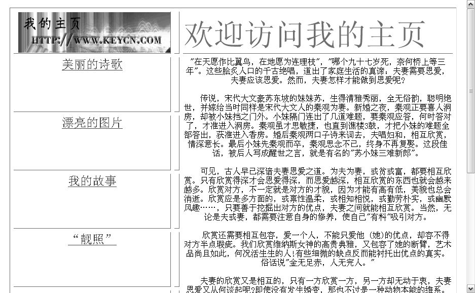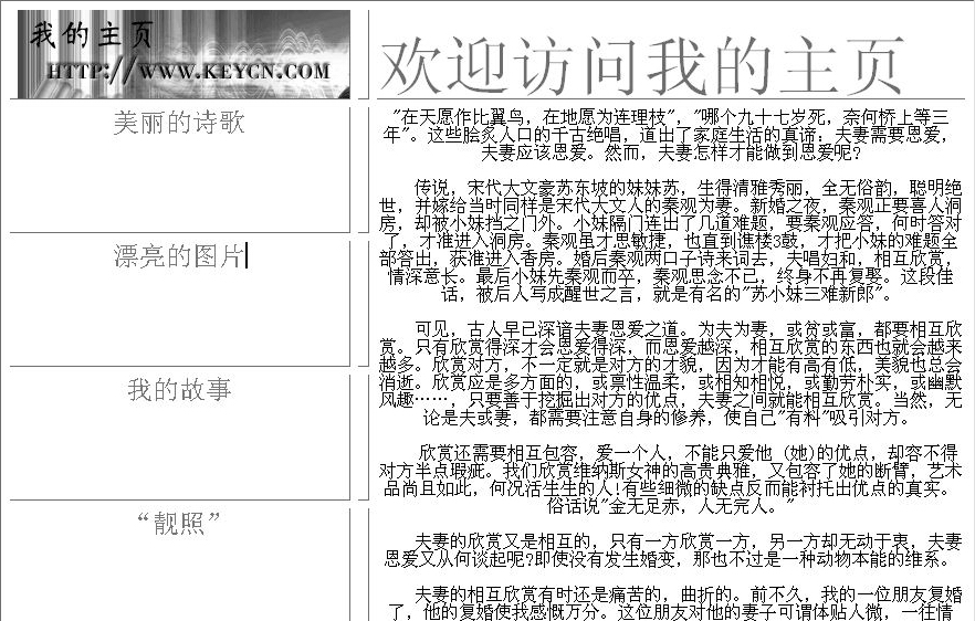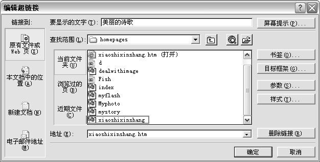 在图3中选择欲作为“链接目标”的资源,在此我们选择“xiaoshixinshang.htm”作为“链接目标”,然后单击“确定”按钮即可。现在再回到主页面中,看看“美丽的诗歌”现在变成什么样了?第一,字体颜色变为蓝色,第二,在文字的下面自动加上了下划线,有了这两条就说明链接创建成功了。使用同样的方法将左边栏目中的所有的标题都和其对应的页面连接起来,然后切换到页面视图,现在我们就可以通过轻轻地点击左边窗口中的“链接源”即可转到相应的页面中(如图4所示)。