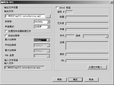 如果想成批地转换MP3或WMA文件,那么在“选项”菜单中选“批处理设置”选项,按“确定”。大家可以看到有比特率、采样率和声道模式。笔者认为比特率影响文件的音质及大小有关键作用,该软件提供32Kbps~192Kbps的比特率,其值越高,音质越好,文件也越大。根据笔者的经验,比特率在40Kbps时,音质基本可以接受,而32Kbps时,声音略有颤抖。采样率最好不要改动,否则转换后的文件,“不堪入耳”。而声道模式对转换影响不大。