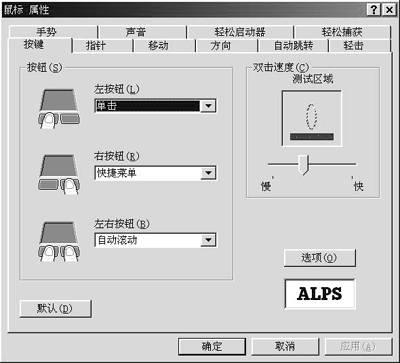 右击系统托盘区中的AlpsPoint图标,从快捷菜单中选择“控制面板”命令,此时会弹出图1所示的对话框,在对话框中可以看到名目繁多的选项页,所有调节任务都是在这个对话框中完成的。
