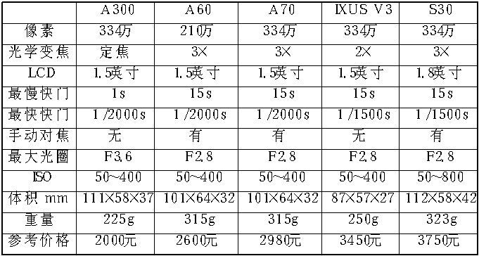 Canon最近推出的PowerShot A300(图3)、A60以及A70是目前A系列产品中的主力军,作为取代A10/20的超低端产品,采用定焦设计的A300已经具备了320万像素、5点智能自动对焦和3种测光方式,这在以往是令人不敢想象的。毫不夸张地说,售价仅仅2000元左右的A300推出标志着低端DC也完全具备了数码冲印的能力,取代传统银盐照片的时代已经到来。