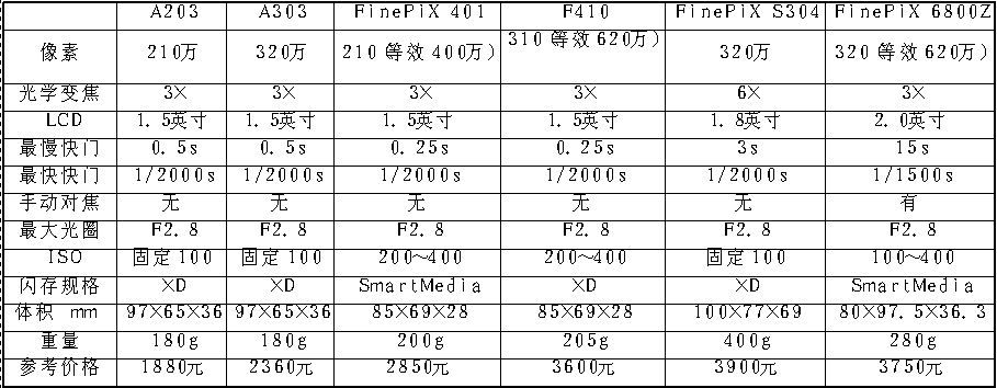 富士相当重视中低端市场,因此4000元以下的产品也不少。FinePiX A系列是最低端的产品,目前以210万像素的A203与320万像素的A303为主(图5)。A203与A303都属于“傻瓜机”类型的产品,上手容易,不过手动功能就几乎没有了。然而与同价位同像素的产品相比,这两款产品最大的特色便是支持3×光学变焦,让用户在取景时十分方便。略有遗憾的是,A203与A303的对焦速度较慢,不适合抓拍,而且ISO指固定为100。总体而言,价格便宜的A203与A303适合那些希望用DC取代传统FC傻瓜机的用户。