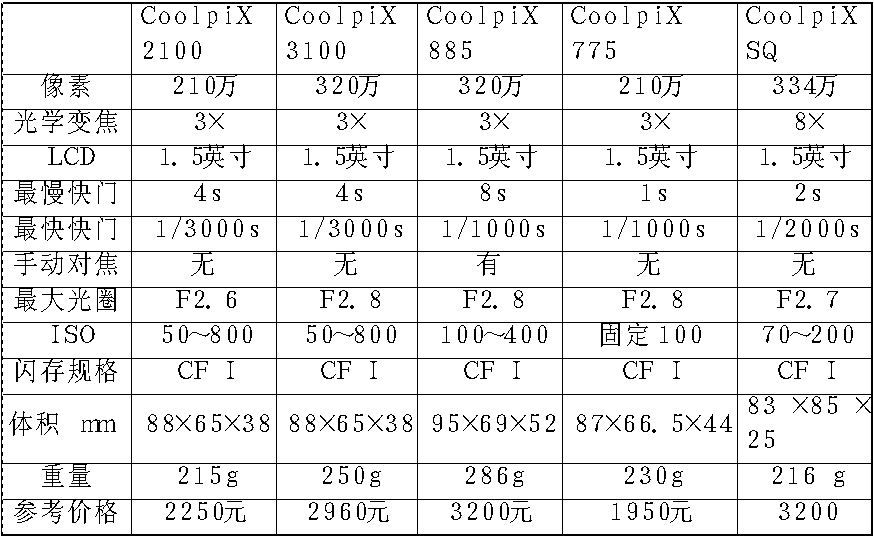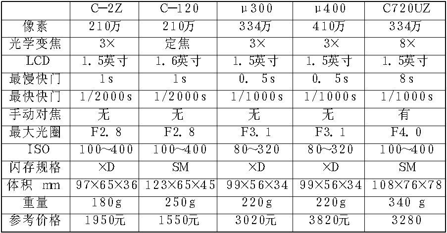 当然,像素仅仅是一个方面,我们还要关注一下其他的技术指标。以下列举的五款DC具有一定的代表性,我们也可以从中看出不同价位的产品在各方面的区别: