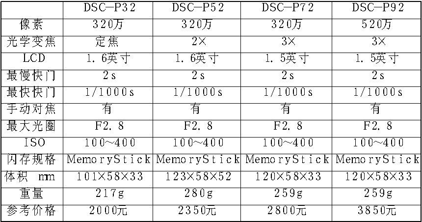 DSC-P32、DSC-P52、DSC-P72、DSC-P92是目前SONY在中低端市场的主打产品,并且都是全新的升级型产品。尽管这些P系列没有太多的亮点,不过SONY在各种品质方面的完善还是有目共睹的,这些都是单凭技术指标所不能反映的。DSC-P52和DSC-P32(图13)采用了320万像素的原色Super HAD CCD,成像质量相当不错。DSC-P52和DSC-P32的区别在于前者具有2×光学变焦能力,而且微距模式时能在8cm自动对焦,后者采用定焦设计,微距能力为10cm。DSC-P72基本上与DSC-P52和DSC-P32处于一个档次,像素也是320万,只不过具备3×光学变焦能力。相对而言,DSC-P92最为引人注目(图14)。这款具备500万像素的产品只有4000元不到,光学变焦也达到3×。总体而言,DSC-P系列在外形设计上很见功力,女性用户对它总是青睐有加,而其表现以及价格也确实没有让人失望。