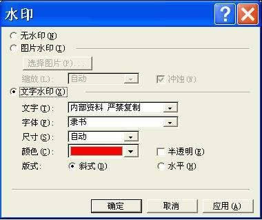 2.在弹出的“水印”设置窗口中(图1),可以为文档添加图片水印或者文字水印,只要选中“图片水印”或者“文字水印”即可。比如选中“文字水印”,在文字后面输入需要的水印文字,如“内部资料 严禁复制”,然后为水印选择相应的字体、尺寸、颜色、版式等设置,单击“确定”就可以为你的文档添加上水印了(图2)。