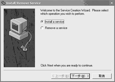 运行srvinstw.exe以后,可以看到有两个选项:添加或删除(图3)。点击下一步输入你要新增加的服务名(这里我们可以用Notes命名)后,继续点击下一步,指定你需要作为服务的可执行文件的具体路径(在本例中记事本程序的路径为C:\Windows\Notepad.exe)。