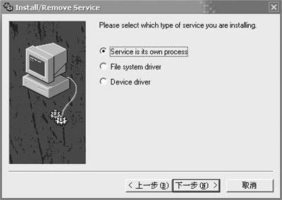 完成以后继续往下操作,这里会看到3个选项(图4):分别对应服务应用于自己的进程、文件系统驱动和设备驱动,由于Notes是应用程序,这里我们选择第一个选项:service is its own process(应用于自己的进程)。