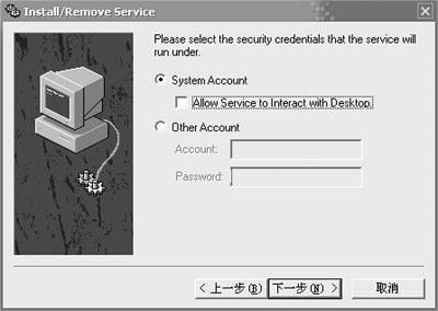 点击下一步后会要求服务的运行环境(图5),一般我们采用第一个,就是作为系统账户运行,如果以后需要修改,可以在“控制面板→计算机管理→服务→服务”属性中重新定义。第一个选择下面有一个复选框,这里是指是否运行和桌面交换,用途是任何用户都可以使用这个服务,建议选中。同样,如果以后不需要这一项功能的话,也可以在“控制面板→计算机管理→服务→服务属性”中取消掉。