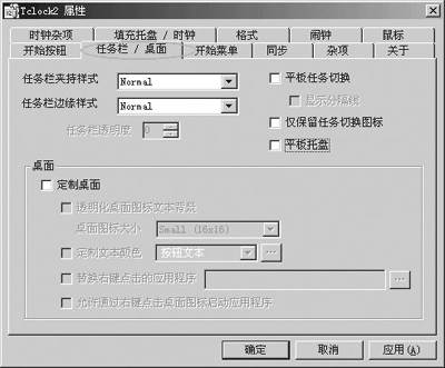在这里我们就可以根据需要调整自己的任务栏了,包括可更换“开始”按钮的图案、字体和样式,定制“开始”菜单的图案,调整任务栏边缘的样式,改变时间栏的显示格式等,Tclock2甚至还可以设置桌面图标的大小和文字的透明颜色,另外激活“闹钟”项可以进行定时的提示,“同步”设置还可以定时更新服务器的最新信息。