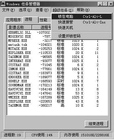 它的功能甚至比Windows 2000/XP上的任务管理器还要强大。除了可以查看系统中正在运行的程序、进程以及内存、CPU资源占用率外,还能快速锁住电脑,可将任何窗口设为顶级或一般等。尤其是锁住电脑功能非常实用,可以保证在你暂时离开时,其他人无法进入你的电脑系统。
