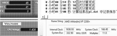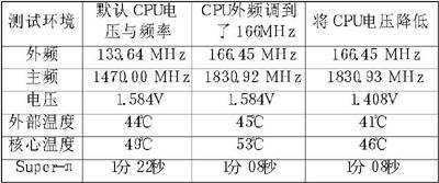 因为我们采用的是DDR333的内存,为了排除内存对降压超频的影响,我们决定在166MHz的外频下对CPU进行降压。我们以0.025V为一阶下调电压,在将电压下降到1.375V的时候,进入操作系统后死机。降到1.350V后机器无法启动,最终我们将系统稳定在1.400V(“M.O.M”测量为1.408V)下,这时我们发现CPU温度居然比超频前的温度还要低3℃~4℃,并且CPU性能没有丝毫的降低。