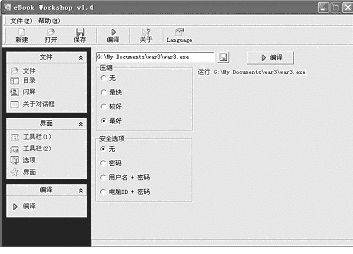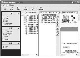 《e书工场》(下载地址:http://tj-http.skycn.net:8080/down/ebook1.4_cn.exe)是将HTML页面文件、图片、Flash等捆绑成EXE电子文档的制作软件。该软件制作电子书的过程相当简单,并且可以对制作的电子书进行部分或全部加密,制作出的电子书也相当漂亮。下面我们就以把一堆“魔兽争霸3”的网页制作成《魔兽争霸3全攻略》的电子书为例进行介绍。