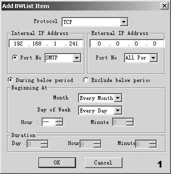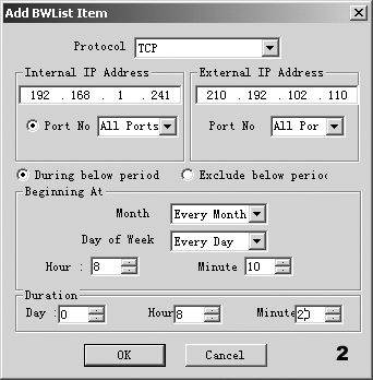 黑名单时,是设置在所设时间内禁用还是在除所设时间以外其他时间禁用,白名单时正好相反。Beginning At是设置开始时间,Duration是设置持续时间为多长。若禁止局域网中IP为192.168.1.241的计算机使用所有网站的SMTP端口,则可以设置为图1;若设置IP为192.168.1.241的计算机从每天的8:10开始,则持续8小时20分不能登录http://www.dlsfe.com,其他网站正常的设置方法如图2。外部IP地址:210.192.102.110可以在Windows的运行中使用ping www.dlsfe.com -t而得到。白名单的操作方法类似,只设置某些不受限的计算机。