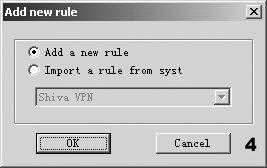 1.建立规则名称。单击“Access Rules(规则设定)”,在打开的规则配置窗口中单击“Add(添加)”,在对话框中选择“Add a new rule(添加新规则)”选项,增加一条访问规则,如图4(“Import a rule from syst”选项的作用是从文件中导入规则,用户可以从http://www.sygate.com/support/applications.htm下载所需信息),单击“OK”,再选择Current Rules(当前规则)列表中的New Apprule,单击“Rename”将它更名为QQ。