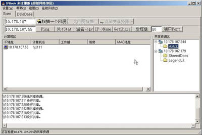 如果你想查任意网段的所有机器的计算机名与共享资源,可以将本网段IP地址范围改成你想要查的地址范围。以10.178.107.XXX的形式显示的就是网段范围。然后点击“查在线机器”和“检验共享”这两个按钮,可以查出计算机名与共享资源。