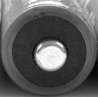 3)正品:正极端电帽下垫有一个类似纸片的黑色无孔(注意,是无孔)纤维垫片,用来防止正负极短路(见图4)。