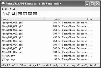 更令人惊喜的是FunnyPhone还有一个免费的桌面端的转换工具,同样可以去http://www.funnysoft.org下载,安装好后就可以使用了。这个转换工具使用时同样十分方便,首先启动程序,然后把想要转换的图片(gif格式,大小为73×26像素)和铃声(emy格式)直接拖进去并且保存,最后同步到palm中就行了(如图6)。