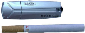 原来,它的外形的确比较小巧,在我试用过的所有闪存产品中,它是最小的(图为该闪存与香烟的大小对比),经实测,它的外形尺寸为63mm×18mm×10mm,重量只有10g。在做工方面,它的外壳采用了流线型,再加上银白色的镀层,手感和外观都还不错,不过上下外壳的接缝部分贴合不是很紧密。它的侧面有一个写保护开关,而在其后部有一个独特的体贴用户的设计,那就是双面读写状态指示灯。当闪存读写文件时,无论从哪个方向看过去,都能准确知道它的工作状态。