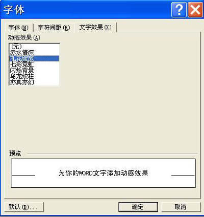 ①选定需要添加动感效果的文字,单击菜单栏上的“格式”菜单命令,从下拉菜单中选择“字体”命令,随后弹出“字体”设置窗口(如图)。②在“字体”设置窗口中,单击“文字效果”选项,然后在“动态效果”下面的列表框中选择一种动态效果,如“礼花绽放”、“七彩霓虹”、“亦真亦幻”等,然后单击“确定”按钮,这样就可以使你的文字活灵活现了。
