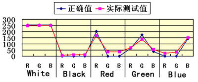 扫描仪的扫描成像质量不仅取决于精度,还取决于它的色彩还原能力,所以我们使用了KODAK的色标卡进行了色彩还原能力测试。测试结果见表2及附图。CX5100在白色色块上的失真较大,这让我们有些意外,但其他各个颜色的实际值和正确值的差异在办公级的扫描仪中算比较小的。在实际使用中,我们仅感觉到CX5100扫描出来的图像有些偏蓝,而其他颜色的表现十分精准,所以扫描出来的图像处理非常容易。在Photoshop等软件中将蓝色减弱一些,即可得到与实物(照片等)相同的色彩效果。