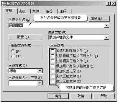 在弹出的“常规”选项页中,文件名默认就是要压缩的文件的原文件名,可以修改。如果压缩文件将用于上传到网上供大家下载的话,建议将中文的文件名改为英文或拼音,这样可以避免在网络传输过程中出错。