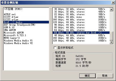 MPEG-1文件的音频部分一般采用MPEG-1 Audio layer Ⅱ格式,码率高达224Kbps,需要将它压缩成体积小的MP3格式。在音频菜单中先选定“完全处理模式”及“来源音频”,然后选择“压缩”命令,并在弹出的“设置音频压缩”对话框中选择“DivX ;-) Audio”,规格为“64kbps,44 KHz,Stereo for DivX ;-)”(图4)。