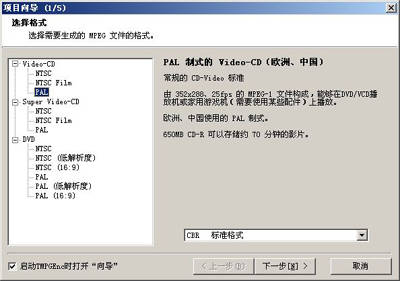首先,启动TMPGEnc后会弹出项目向导窗口(图5),有“VCD、SVCD、DVD”三类模板可供选择,每类模板都有NTSC和PAL两种制式,其中DVD的这两种制式分别还有“低解析度”模式,这种模式使用的是VCD的解析度,这样可在DVD碟片上存放时间长达270分钟的影像。你选择的模式都会在窗口的右边有详细的说明。如果要制作VCD,可以选择“Video-CD”下的PAL制式后单击“下一步”。