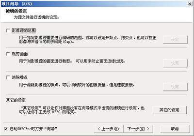 接下来进行“滤镜的设定”,选择“影像源的范围”可指定对影像文件进行编码的范围。你可以指定编码的开始点与结束点,并可校正影像与声音间的同步间距。“裁剪画面”用于对源影像画面进行裁剪,可去掉没必要的边缘。“消除噪点”用于消除视频噪点,以优化影像效果,设置时如果对设定的值不太了解,可直接在画面上看到预览的效果。在通常情况下可以不用理会这个步骤,直接点击“下一步”就行了(图6)。