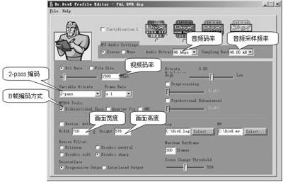 运行Dr. DivX Profile Editor,修改默认设置(图8),可修改音频和视频的有关参数,通常我们用Dr.DivX将VCD或DVD编码成DivX AVI,这样我们可以编辑四个任务文件,分别使用表2中的参数。