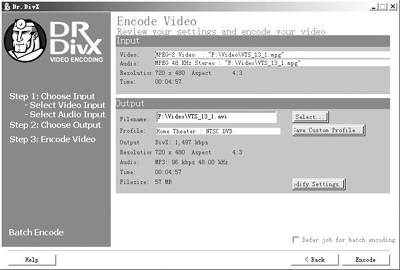 最后在Step3中(图11)设置输出文件的路径与文件名,点击“Encode”即可开始编码。如果想改变原有的设置可单击“Modify Settings”按钮进行修改。设置了2-pass,编码会分两个步骤来进行,最后才会得到效果更好的DivX视频。