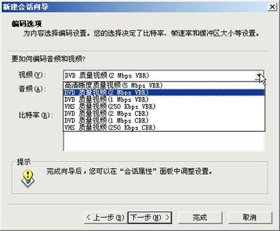 接下来进行编码选项设置(图13)。在视频下拉列表中根据源文件的质量选择一种视频编码方式,如果源文件是DVD质量的MPEG-2文件可选择“2M bps VBR”,音频可选择“CD质量音频VBR”。VBR是可变码率,可根据场景动态分配数据,质量与压缩率均优于固定码率的CBR,这也是Windows Media 9的新特性之一。设置好后点击“完成”回到主界面。