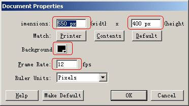 第一步:打开Flash MX软件,点击Properties属性面板中的Document properties按钮,在弹出的Document Properties对话框中,输入影片的背景色为黑色,其他设置按默认设置,宽度为550像素,高度为400像素,每秒播放12帧(图1)。