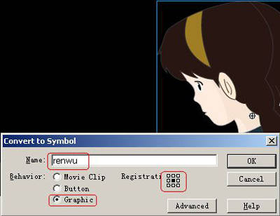 第三步:在时间轴点击按钮新建一个图层,名称为“人物”,将绘制的人物图像放置在图层中。选中人物,按F8键,在弹出的Convert to Symbol(转换为实例)对话框中将人物转换成Graphic,然后选中这个实例,再次按F8键,再将它转换为Movie Clip影片剪辑(图2)。