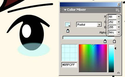 第八步:双击进入新人物的影片剪辑,在第55帧处按F6键,然后新建一个图层,使用圆形绘图工具绘制一个无边框的椭圆形在眼睛的底部,选中后在Color Mixer面板中设置色彩的渐变方式为Radial圆形渐变填充,色彩及透明度如图6所示。